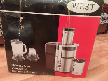 Sağlam şirələr, smuzi və ədviyyat üyütmələri üçün praktik və çoxfunksiyalı mətbəx həlli. Marka: WEST. Model üzərində “Stainless Steel Juicer with Blender & Grinder” qeyd olunub.