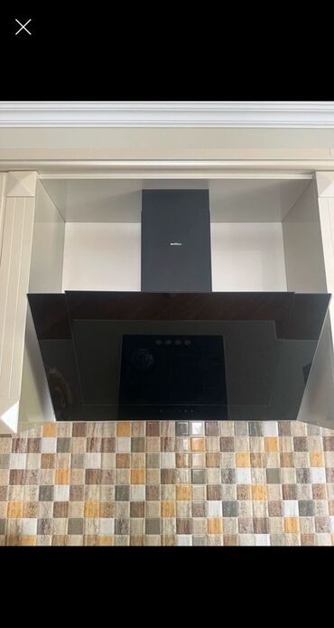 Mətbəx aspiratoru (divara quraşdırılan, şüşə ön panelli) - Rəng: parlaq qara, şüşə ön panel və metal xətləri ilə - Quruluş: şkaf altına/arasına inteqrasiya olunan, önə doğru qabarıq dekorativ pane...