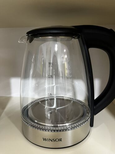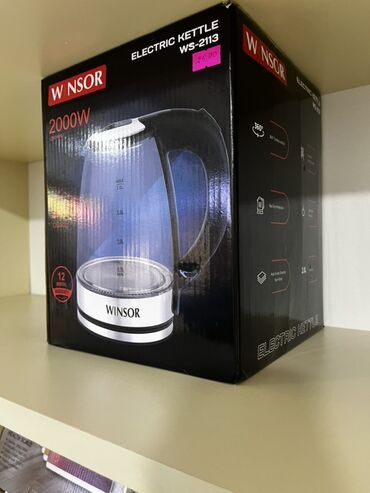 Qutu üzərində: Electric Kettle WS-2113, 2000W, 2.0L, yüksək keyfiyyətli şüşə və paslanmayan polad detallar, 360° fırlanma, quru qaynamadan müdafiə.