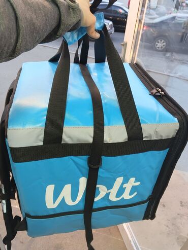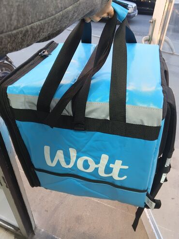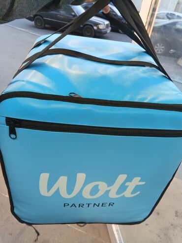 Kurye və restoranlar üçün peşəkar daşıma çantası; velosiped, skuter və piyada çatdırılmalarına uyğun. Wolt loqolu “Partner” yazılı dizayn.