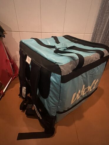 Wolt brendli termal çatdırılma çantası - Rəng: açıq mavi (Wolt loqolu), qara kənarlar - Material: qalın izolyasiyalı, istiliyi və soyuğu saxlamaq üçün termal qat - Ölçü: iri həcmli kvadrat forma (...