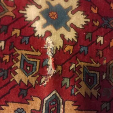 İşlənmişGədim xalca 100 ildən cox yaşı var. Antikvardir. eniİ 1,25 metr, uzunu 2 metr. Rəngi şux, tünd girmizi. Ortasında balaca yırtığı var.