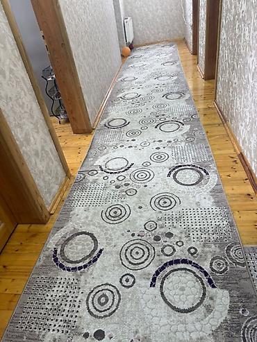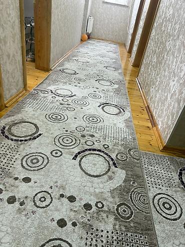 Xalça dəsti – 5 ədəd 1) Uzun koridor xalçası: geometrik dizayn, qara-boz-qırmızı rəng kombinasiyası, kvadrat bloklar və dairə motivləri. Dar keçidlər, dəhliz və yataq otağı arası üçün uyğundur. Qa...