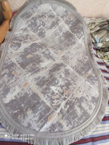 - 1 ədəd oval xalça, kənarları püsküllüdür; üstündə abstrakt naxışlar var (boz-bej qarışığı).