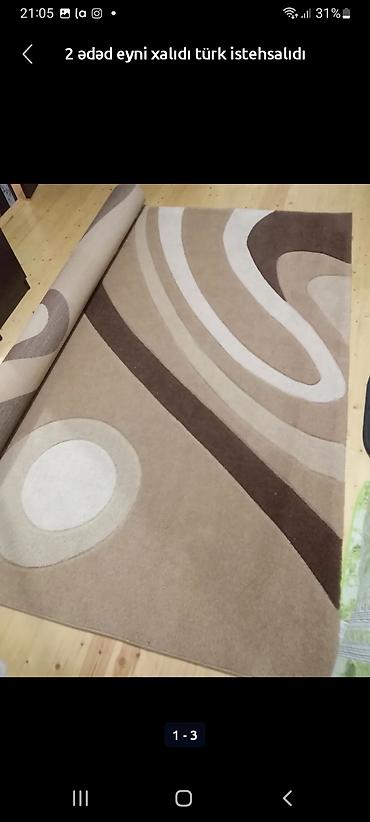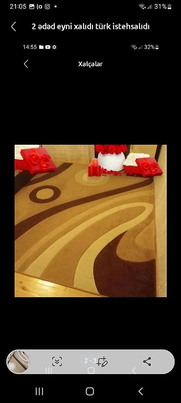 Xalça satılır:ölçüləri( 2.50-3.50) eynisindən iki ədəddir ikisi də eyni ölçü tük istehsalı kaşmir xalı 1 ədədin qiyməti 100azn