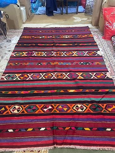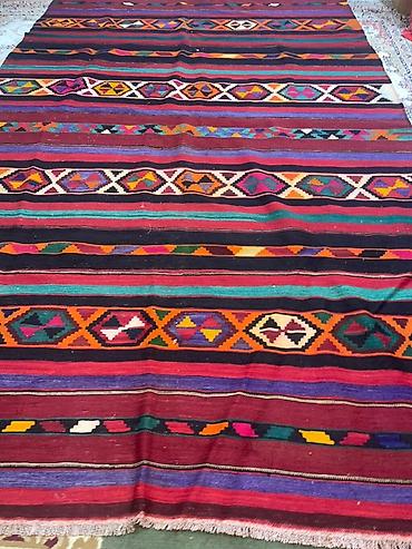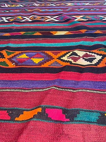 Xalça – əl toxuması kilim üslubu - Naxış: ənənəvi geometrik motivlər, mərkəzdə çoxrəngli simmetrik kompozisiya, geniş haşiyə - Rəng palitrası: tünd qırmızı fon, yaşıl, narıncı, çəhrayı, sarı, qara...