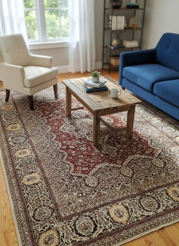 Detallı Şərq ornamentləri və dərin bordo tonu sayəsində məkanın vizual dərinliyini və zərifliyini artıran dekorativ xalça.