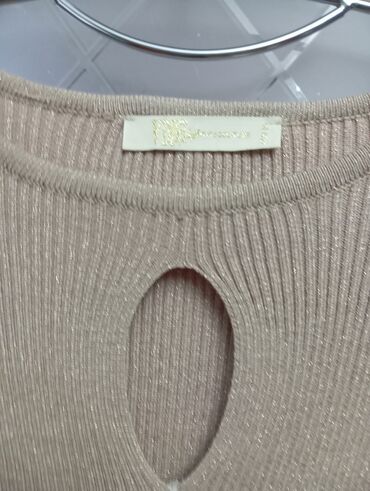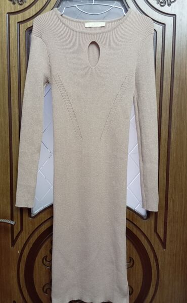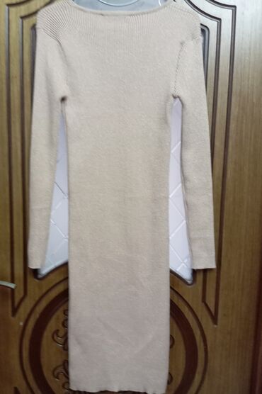Pulsuz çatdırılmaÜnvandan götürməXanım üçün bej rəngli, zərli sapla toxunma, dar bədən uzunluğu dizdən olan yun paltar. S/M razmerlərə rahat olur. Donun sinəsi yumru pəncərə şəkilli kəsimlidir. Əyində çox gözəl qalır. Zövqə görə kim istəsə belinə kəmər vura bilər. İki dəfə geyilib, yeni kimidir.
