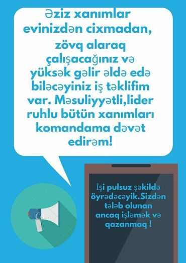 Ev şəraitində vaxtınızı səmərəli dəyərləndirərək öz biznesinizi qurmaq istəyirsinizsə, bu fürsət xanımlar üçündür. İşləmək və qazanmaq kifayətdir.