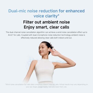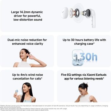- 5 daxili EQ səviyyəsi: Standard, Enhanced treble, Enhanced bass, Enhanced voice, Boost volume. Xiaomi Earbuds tətbiqində bir toxunuşla rejimlər arasında keçid.