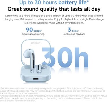 - Batareya ömrü: Qulaqlıqların tək şarjla 6 saata qədər dinləmə müddəti, şarj qutusu ilə birlikdə ümumilikdə 30 saata qədər. Cəmi 10 dəqiqəlik sürətli enerji ilə təxminən 1 saat musiqi.