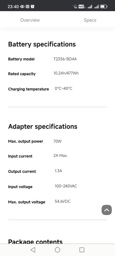 - Akkumulyator: T2336-BD4A, 10.2Ah / 477Wh