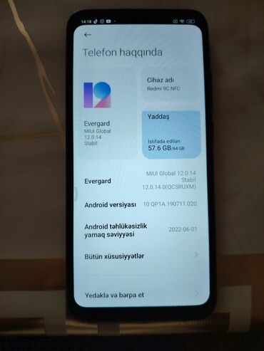 SALAM AXŞAMIN XEYİR NƏ VAR TELFON HAQQINDA MELUMAT VAR BURDA VHATSAP AKTIFDİR. Xiaomi Redmi 9C – 128 GB - Cihaz adı: Redmi 9C - Yaddaş: 128 GB (hazırda 27.4 GB istifadə olunub) - MIUI versiyası: ...