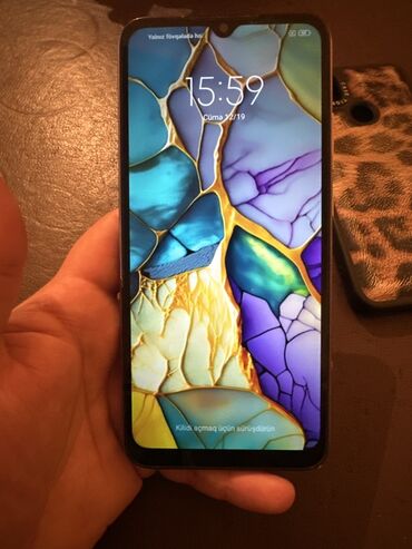 Xiaomi Redmi smartfon - Rəng: Mavi, teksturalı arxa qapaq - Ekran: Tam ekran dizayn, damla-notch ön kamera; ekran saat/lockscreen görünüşü ilə - Arxa kamera: Kvadrat modulda çoxlu linza (AI Camera...