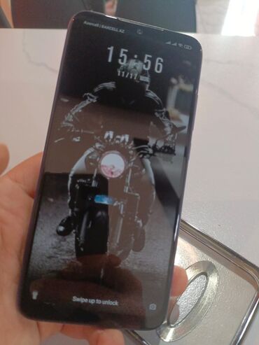 Qutuda metal halqalı tutacaq (ring holder) görünür. Motosiklet temalı ekran şəkli ilə gəlir; ekran kilidi “Swipe up to unlock” göstərişi var. Şık dizayn və güclü 48MP AI kamera ilə gündəlik istifadə və foto üçün uyğun seçim.