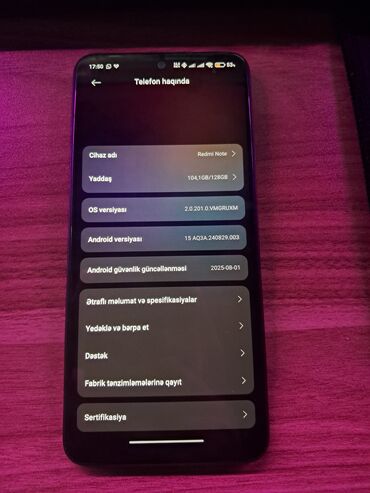 - Yaddaş: 128 GB (telefon məlumatlarında 104,1 GB/128 GB görünür)