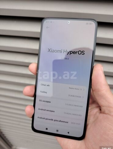 Xiaomi Redmi Note 13 – HyperOS ilə Texniki göstəricilər: - Model: Redmi Note 13 - Sistem: Xiaomi HyperOS (OS versiyası 2.0.206.0 VNRHUXM) - Android versiyası: 15 (AQ3A.240829.003) - Android təhlük...