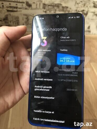 Xiaomi Redmi Note 8 – 64 GB - Ekran: 6.3" FHD+ IPS, damla-notch ön kamera - Yaddaş: 64 GB daxili (şəkildə 32.9 GB istifadə edilib), microSD dəstəyi - RAM: 4 GB (seriyanın tipik komplektasiyası) - ...
