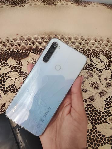Arxa tərəfində dörd kamera, barmaq izi skaneri və "Redmi" loqosu olan Xiaomi Redmi Note 8 smartfonu. Cihazın arxa hissəsi ağ rəngdədir və aşağı hissəsində şüşənin zədələnməsi müşahidə olunur. Bu smartfon gündəlik istifadə üçün uyğundur.