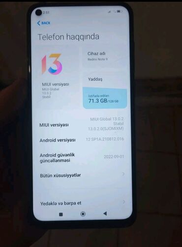 - Yaddaş: 128 GB daxili yaddaşdan 71.3 GB istifadə olunub (şəkildə göstərilir). microSD dəstəyi mövcud model seriyasındadır.