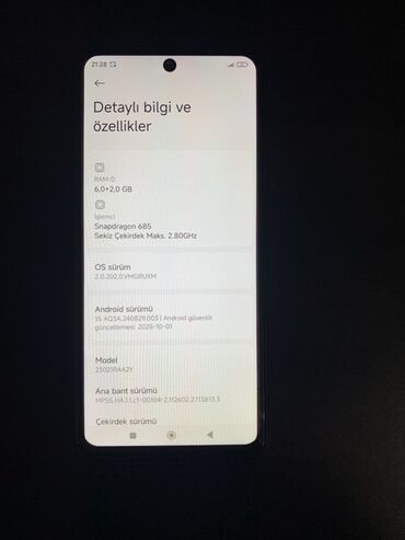 - Sistem: Android (təhlükəsizlik yeniləməsi 2025-10-01), MIUI/HyperOS versiyası 2.0.202.0.VMGRUXM