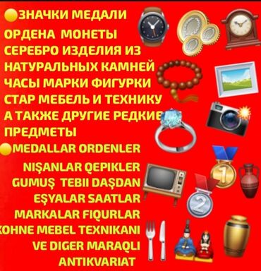 Xidmət: Antikvar və köhnə əşyaların alınması. Покупаю различный редкий антиквариат и предметы старины. по договорной цене. Təsvir: - Medallar, ordenlər, nişanlar - Qəpiklər və nadir sikkələr - Güm...