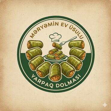 • Qida/brend etiketləri üçün illüstrativ loqo – “Məryəmin ev üsulu yarpaq dolması” tipli dad və ənənəni vurğulayan retro üslub