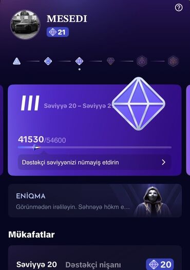 - Dəstəkçi proqramı səviyyəsi: 20-dən 21-ə keçid mərhələsində (41,530/54,600 xal), 21 nişanı