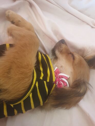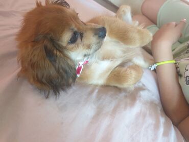 Ana atasının Seklı var 1aylıq erkek bala Miniatür it balası – yığcam ölçü, uzun və yumşaq şaftalı rəngli tüklər, ağ alın-qarın bölgəsi. Qısa pəncələr, yuvarlaq sifət, qara burun və parlaq qəhvəyi g...