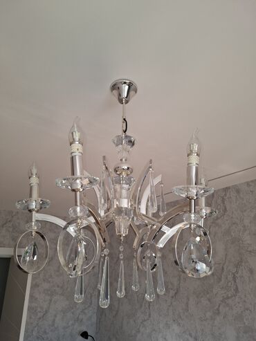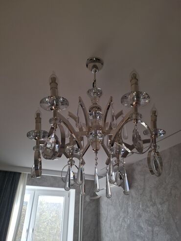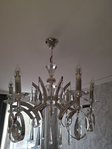 - Dizayn: 6 şam formalı qol, hər qolda şüşə/kristal boşqab və asma damcı-kəsimli prizmalar; mərkəzdə dekorativ kristal sütun və asqılar