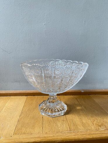 Şəffaf xrustal meyvə qabı. 50 il öncə alınıb. Deffecti yuxarı hissəsindədir, diametri 21, hündürlüyü 12 sm təşkil edir.