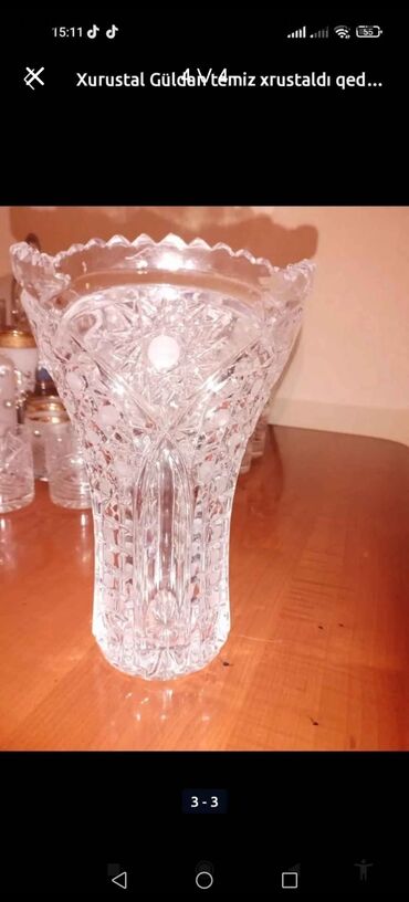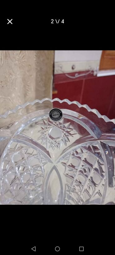 Kəllə-kəsik əl işi kəsmə qedimi xeustal guldan cox agir guldandirqedimi temiz xrustaldir - Material: qalın, şəffaf kristal şüşə - Dizayn: dərin kəsmə ornamentlər, romb və rozet motivləri; işıqda g...