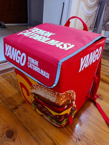 - Rəng: qırmızı, üzərində YANGO və “Yemək çatdırılması” yazıları, burger temalı çap