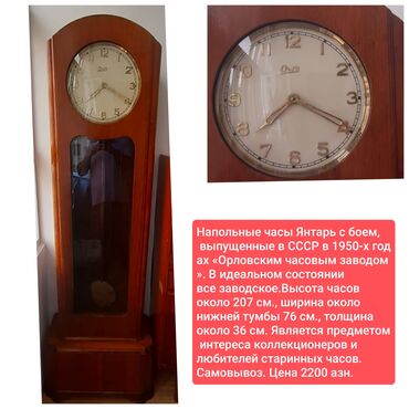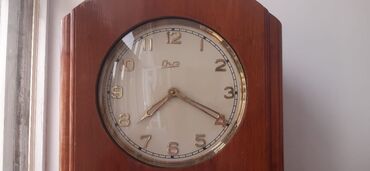 Məhsul: Köhnə saatlar kolleksiyası Təsvir: - Mayak divar saati: taxta korpus, metal saat göstəriciləri və indekslər, mərkəzdə sarma mexanizmi üçün açar yuvası. Siferblatda “Mayak” yazısı və “Made ...
