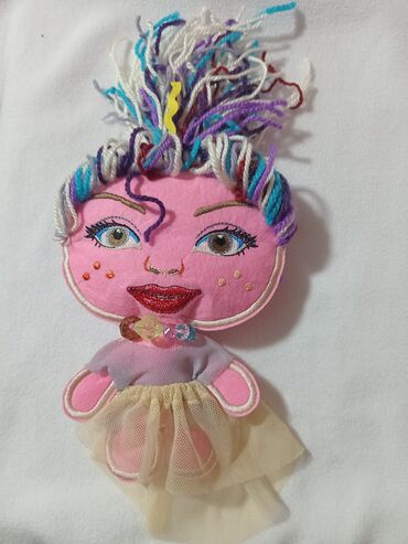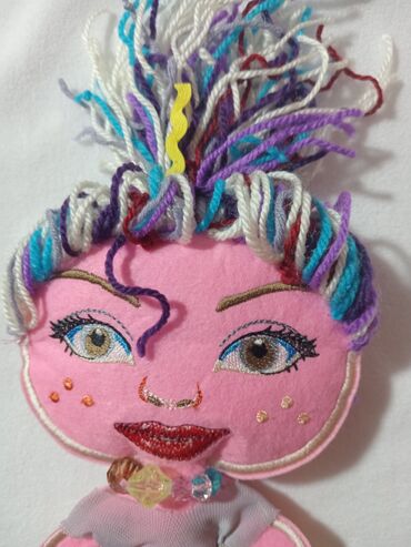 - Material: yumşaq filt (pambıq əsaslı), iplikdən hazırlanmış çoxrəngli saçlar, tikməli üz detallar (gözlər, qaşlar, dodaqlar), qızılı-çəhrayı dekor tikmələri