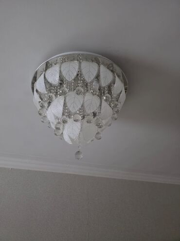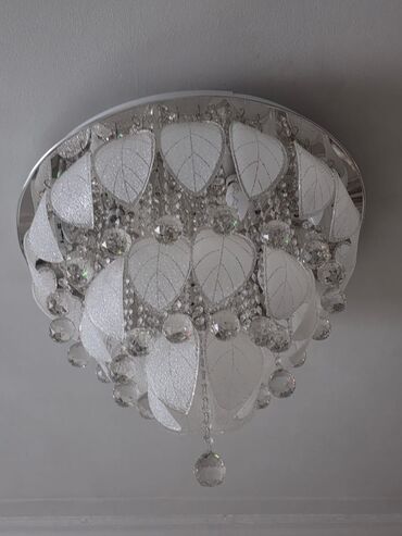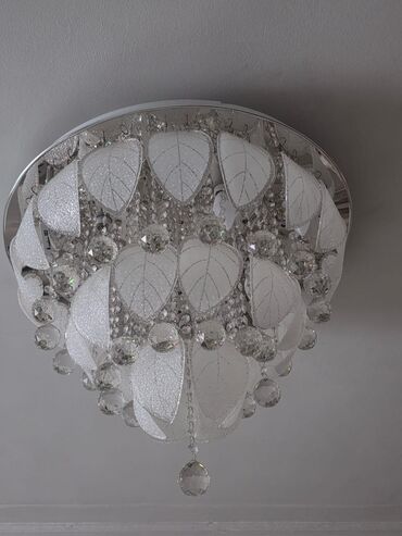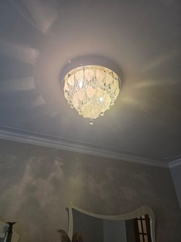 Zərif dizaynlı asma çilçıraq - Forma: dairəvi karkas - Material: parlaq qızılı rəngli metal konstruksiya, fasetli şəffaf şüşə/kristal asqılar - İşıq mənbəyi: çoxsaylı E27 tipli lampalar üçün yuval...
