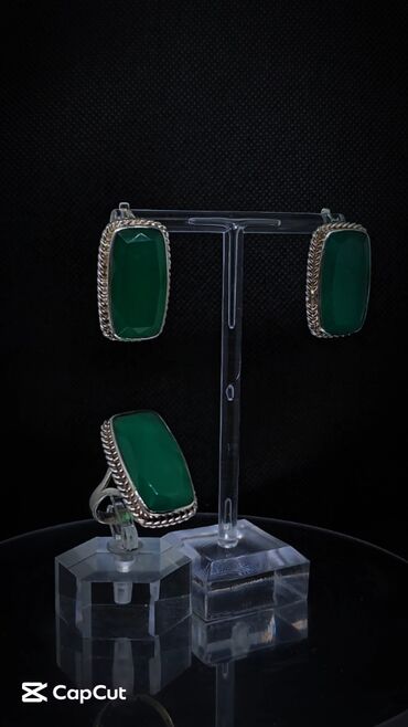 Möhtəşəm! Tek ekzemplyarda (nüsxədə)!gümüş 925prob dəst Rusiya istehsalı Tebii Jadeit qaslar – sırğa, üzük və kulondan ibarətdir - Dizayn: Yarpaq formalı parlaq ağ dag bülluru ve canli zümrüd rəngl...