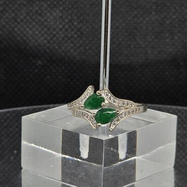 Zərif zərgərlik üzükləri dəsti - 925 sergi mali tebii zumrud sertifikati - Dizayn: üçqat halqalı korpus, üst hissədə armud (damla) formalı iri yaşıl daş - Mərkəzi daş: smaragd rəngli, fasetli kəsi...