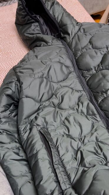 Yasil haki balonka kurtka godekce. Kapusonlu ve cibli. 1-2 defe geyinilib. Ici astarlidir. Etiketinde m yazılıb amma M-L-XL bedene geder