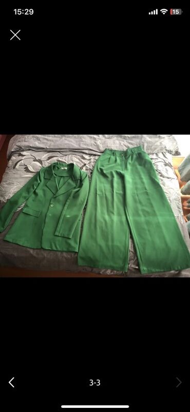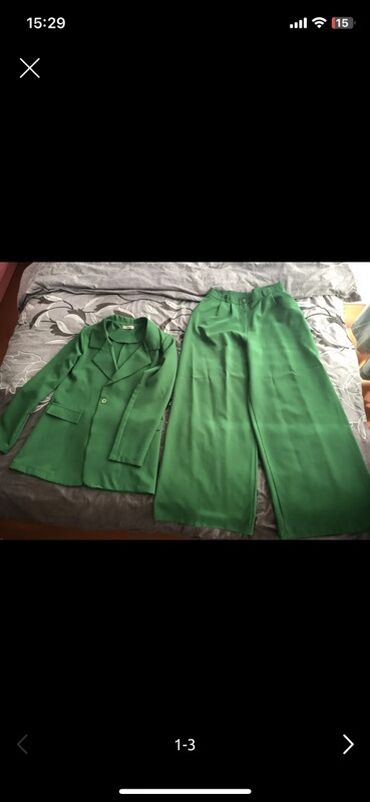 Zümrüd-yaşıl rəngdə qadın kostyum dəsti - Brend: CHILA (etiketdə göstərilir) - Dəst: pencək + şalvar - Rəng: parlaq zümrüd/teal - Pencək: klassik yaxalıq, tək düyməli bağlanma, iki ətəküstü ciblə;...