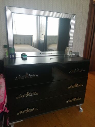 Yataq otağı mebel dəsti Tərkibi: - 2 nəfərlik çarpayı – yumşaq başlıq, taxta korpus. - 2 ədəd tumba (çarpayının hər iki tərəfində). - Komod – 4 geniş çekmece, üstündə güzgü paneli. - Güzgülü sürgü...