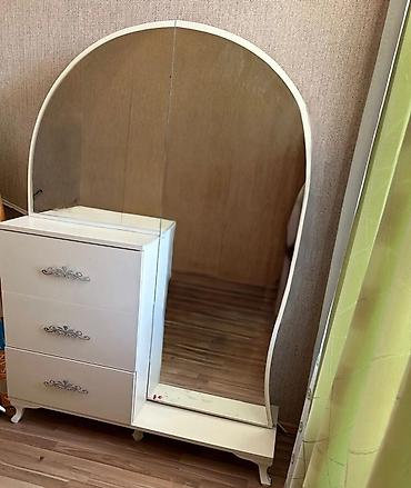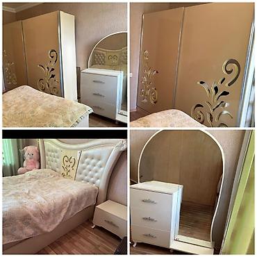 Yataq otağı mebel dəsti - Komplekt: iki nəfərlik çarpayı, 2 ədəd tumba, böyük 5 qapılı şkaf (2 aynalı orta bölmə, aşağıda çekmecələr), geniş komod/tualet masası böyük əyri formalı güzgü ilə. - Rən...