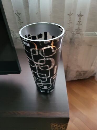 - Vaza 2: silindrik, qara fonda gümüşü həndəsi naxışlar; minimalist və müasir görünüş