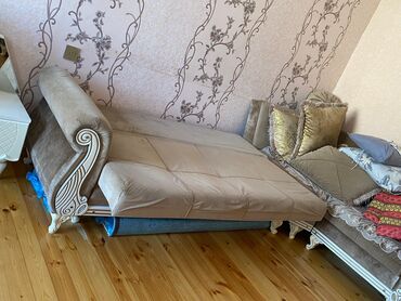 - Yastıqlar: Kənarları püsküllü iri bel yastıqları və iki ədəd qızılı dekorativ yastıq komplektdə