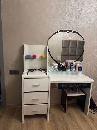 - Makiyaj masası: geniş iş səthi, ön paneldə dekor naxışı, ayaqaltı niş. Böyük dairəvi güzgü.