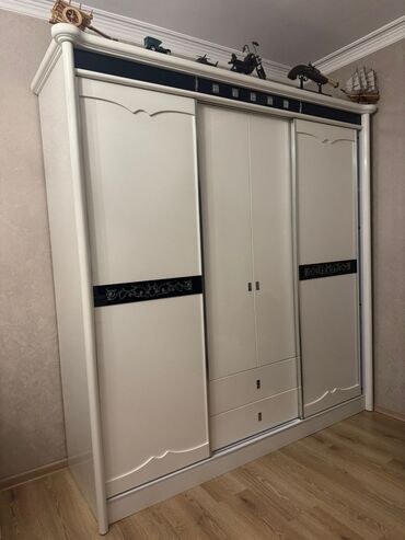 - Geniş qarderob şkafı: 3 bölməli, yanlarda sürgülü qapılar, ortada qapılı bölmə və 2 alt çekmece. Üst hissədə dekorativ haşiyə, qapılarda naxışlı zolaqlar. Asılqan və rəf zonaları ilə səliqəli saxlama imkanı.