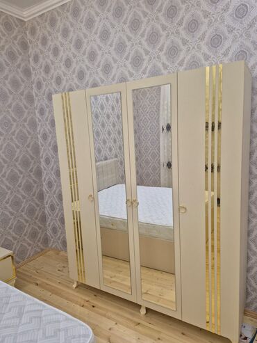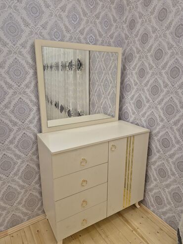 - Güzgülü komod: 4 çekmece + yan qapılı bölmə, üstündə iri güzgü; qızılı xətt və halqa tutacaqlar.