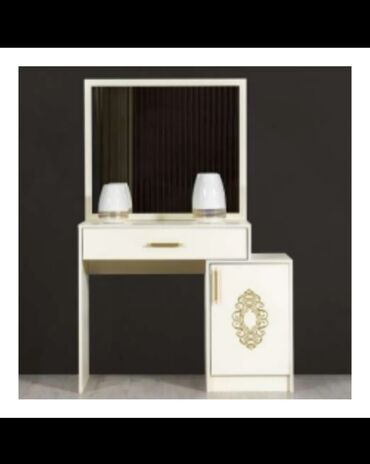 - Makiyaj/komod masası: iri kvadrat güzgü, 1 geniş çekmece, yan şkaflı bölmə; tutacaqlar qızılı rəngdə.