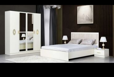 Yataq otağı dəsti – klassik və zərif dizayn Tərkibi: - Çarpayı (yumşaq başlıq, qızılı detallar) - 2 ədəd tumba - Güzgülü makiyaj/komod masası (çekmece və dolab bölməsi ilə) - 4 qapılı şkaf: orta h...