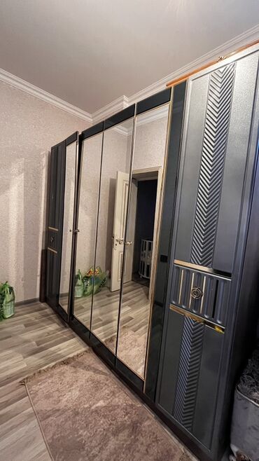 Yataq otağı dəsti - Material: tünd rəngli laminat/MDFlam, parlaq səthli. - Dəst tərkibi: - Geniş 5 qapılı qarderob – mərkəzdə 2 böyük güzgü qapı, hər iki tərəfdə asılqan və rəf bölmələri, aşağıd...